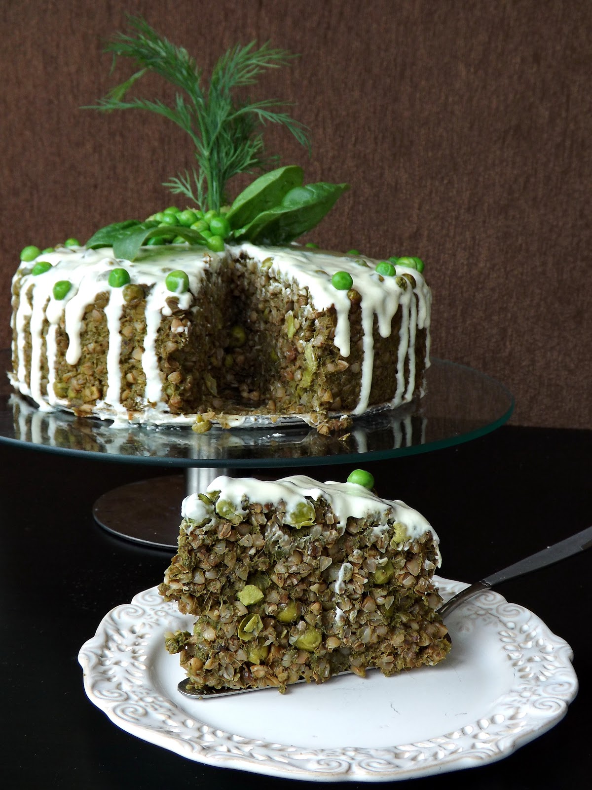 Ten tort, to smakowe zaskoczenie, ale zdrowe połączenie. Pierwsze, seler naciowy ze szpinakiem udusiłam, porządnie doprawiłam, wody dolałam i na zupę krem zmiksowałam. Dobrze ognista, ale fajna w smaku wyrazista. Jednak pomyślałam, że zupa krem, to nic zaskakującego, może przygotować na niej coś nietypowego. Długo nie myślałam i za kombinowanie od razu się zabrałam. Trochę zaryzykowałam, bo pojęcia nie miałam, czy proporcje odpowiednio dobrałam, czy kaszy za mało- za dużo nie dodałam. Ale co tam,następnie jajka, groszku dodałam i do tortownicy masę przelałam. Piekłam chwilę w wysokiej temperaturze, żeby ciasto się zagrzało, a potem zmniejszyłam i trochę serce mi drżało, czy kasza się ugotuje, czy po wyciągnięciu z tortownicy, nic się nie porozsypuje. Po godzinie czekania, zabrałam się do „ciasta” wyciągania, uff , ulga wszystko dobrze wyglądało, ale znów pytanie, czy będzie smakowało. Sos zrobiłam, wierzch nim polałam, trochę zielonych dodatków dodałam, zdjęcia pstryknęłam i dopiero za jedzenie się wzięłam. Uśmiech, błysk w oku , zadowolenie, za to właśnie lubię moje pichcenie, że nawet dziwne dania, nadają się do zjadania. Telefon w dłoń, rodzinę zwołałam i na tort pozapraszałam. Ale ich uprzedziłam, że do słodkich go nie zaliczamy, że kalorii w nim dużo mniej mamy. Zaskoczenie się udało, ale czy im smakowało? Odpowiem za nich sama, TORT został ze smakiem zjedzony w całości – takich to ja lubię gości.